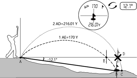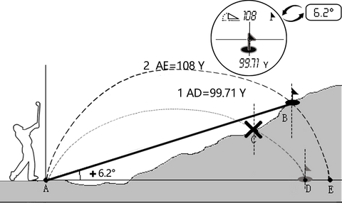 Distance between AB points=AD points spacing is the actual straight-line distance 99.71Y.Hit the ball in accordance with the distance measured with the strike parabolic 1, the angle of slope is + 6.2 °, and the ball will arrive at the point C. To reach the point B, it is necessary to follow the parabola 2. The slope must be the one between point A and point E, i.e. 108Y.